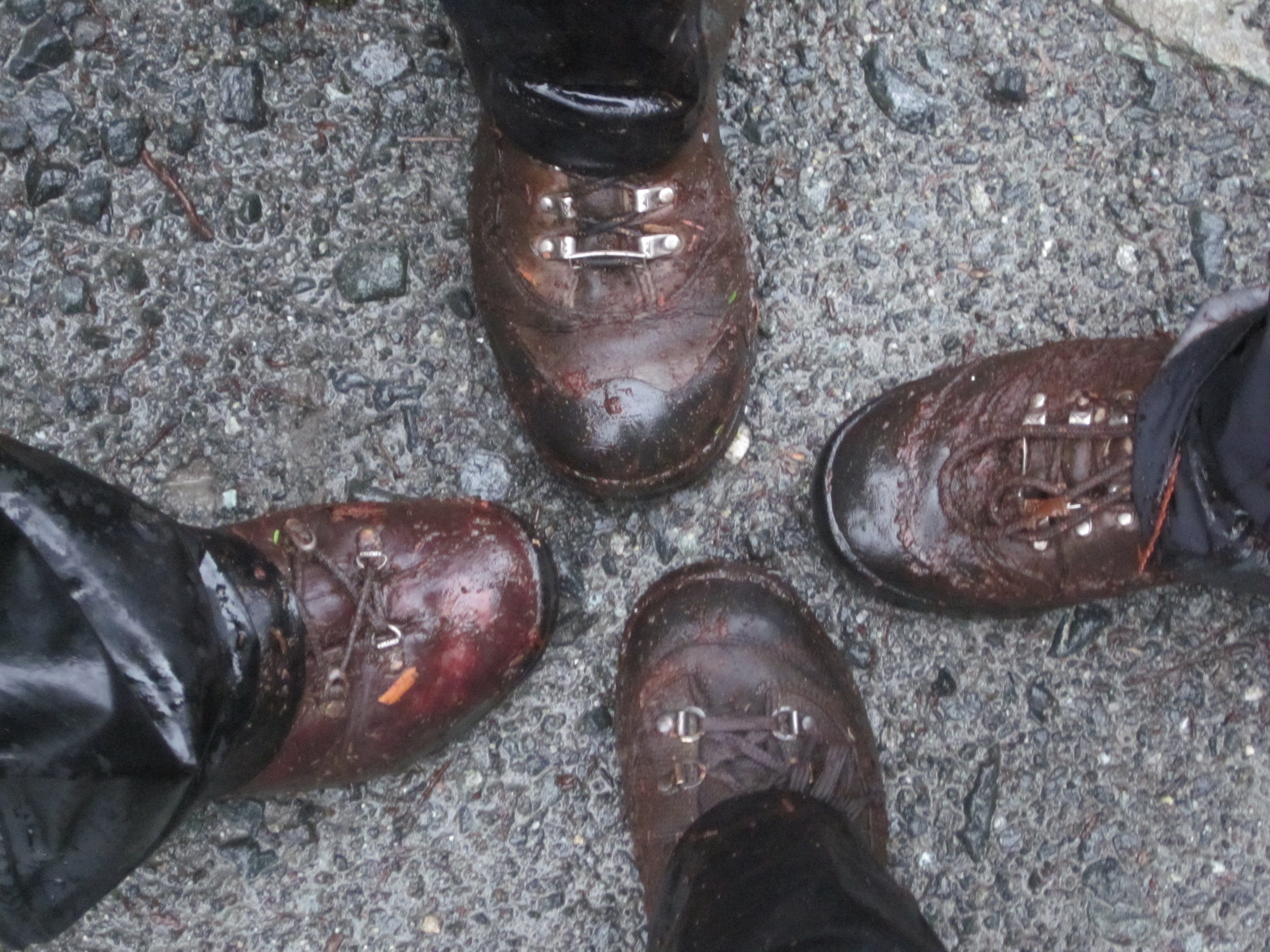 Arriving at the roadway, we took a moment to record the grubby state of our boots (always the sign of a good trip) before stripping off our drenched rain gear and hopping into the van. Snuggled into cozy sweaters, we shared a delicious lunch of quinoa salad while listening to the rain pound down on the roof and relishing the sensation of being warm and dry once more. We all sat quietly for a while, reflecting on our good fortune to have gained an introduction to such a beautiful wild place. Finally, reluctantly, we started the engine and headed home.